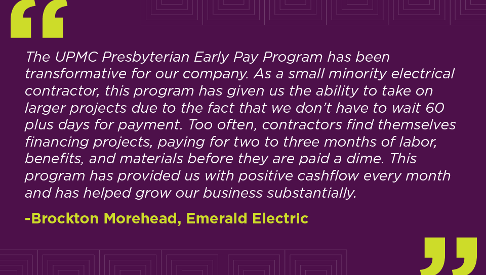 The early payment program is open to certified subcontractors and suppliers who are awarded a contract on the UPMC Presbyterian project. This program provides early payment for approved services, which could help to remove case flow barriers that exist for certain firms.